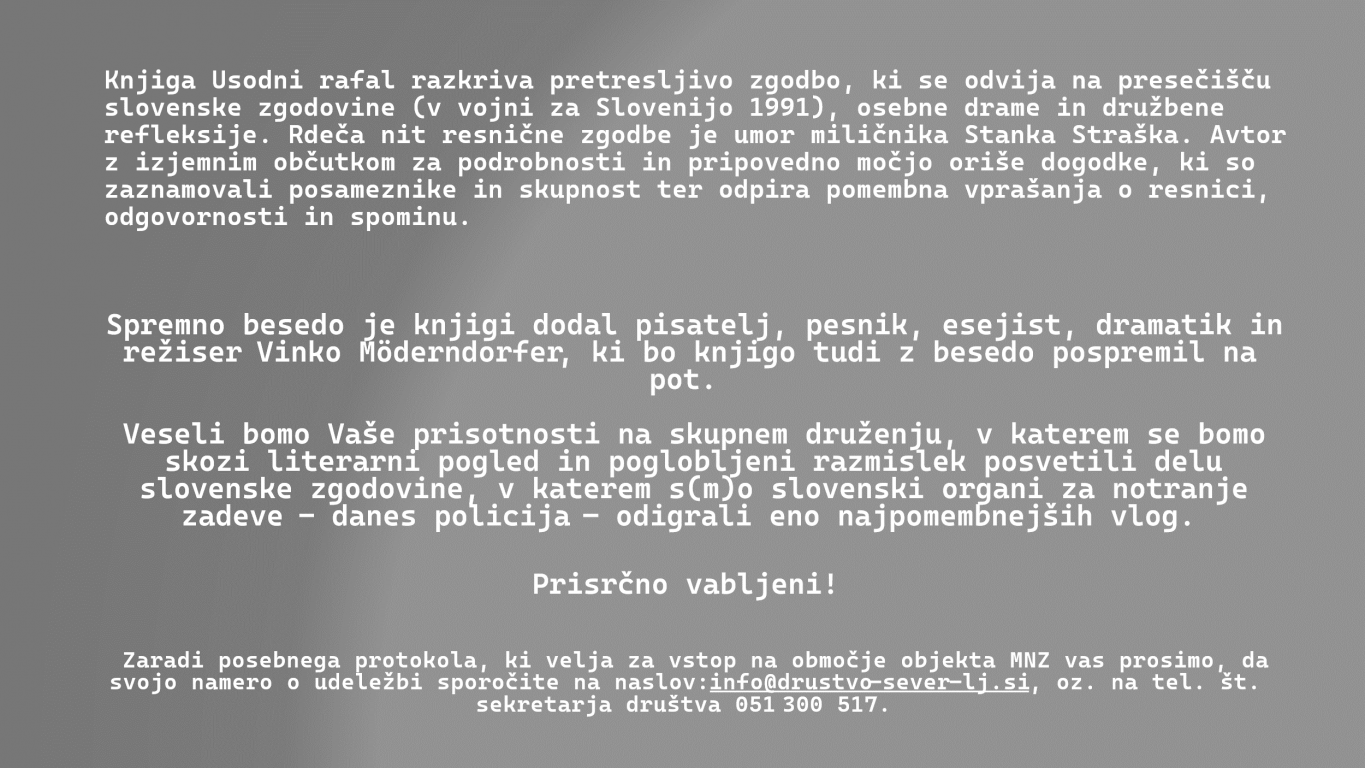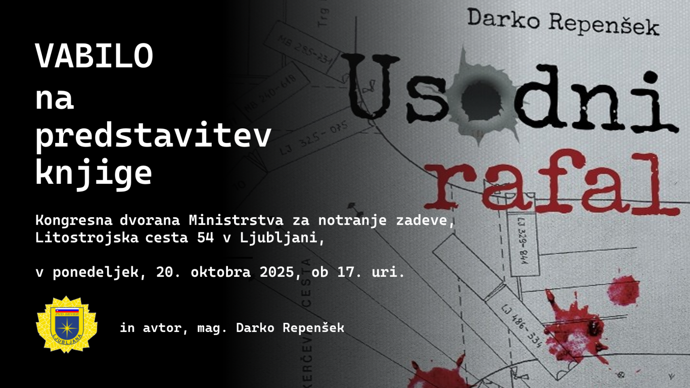 V imenu Policijskega veteranskega društva Sever Ljubljana, vas vabim povabim na javno predstavitev knjige Usodni rafal, ki jo je napisal mag. Darko Repenšek predsednik PVD Sever Ljubljana.
